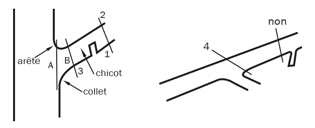 Couper le chicot dans un angle B, presque identique à l'angle A, formé par l'arête et le tronc, sans toutefois toucher au collet.